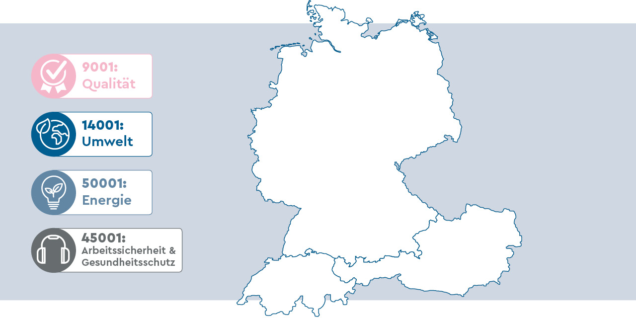 Ganz konkret setzen wir unsere Visionen um, indem wir uns von unabhängigen Institutionen prüfen und zertifizieren lassen. Je nach Anforderung an die einzelnen Standorte setzen wir auf die passenden Managementsysteme. Mit Hilfe eines Qualitätsmanagements nach ISO 9001 erreichen wir höchste Qualität bei unseren Produkten und damit Zufriedenheit beim Kunden. Um das Thema Nachhaltigkeit langfristig in all unseren Aktivitäten zu verankern, wurden an vielen Standorten sowohl ein Umwelt- und Energiemanagement nach ISO 14001 bzw. ISO 50001 als auch die ISO 45001 zur Sicherstellung von Arbeits- und Gesundheitsschutz eingeführt. So setzen wir ein klares Zeichen: Für unsere Umwelt, für unsere Mitarbeiterinnen und Mitarbeiter und für die Effizienzansprüche unserer Kunden.